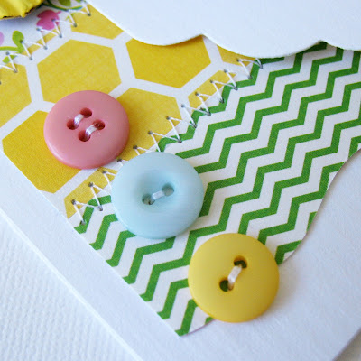 I think I mentioned before that I like buttons! ;) These remind me of candy! Like Sweet Tarts or Smarties. I used lots of the patterned papers in this line for my background, the letter 'u' is from Jillibean soup. No, I don't think they come in yellow. I painted a white 'u' yellow. And I made a big mess of it! And after cleaning up said mess, I realized I could have used my Copics! Duh!
